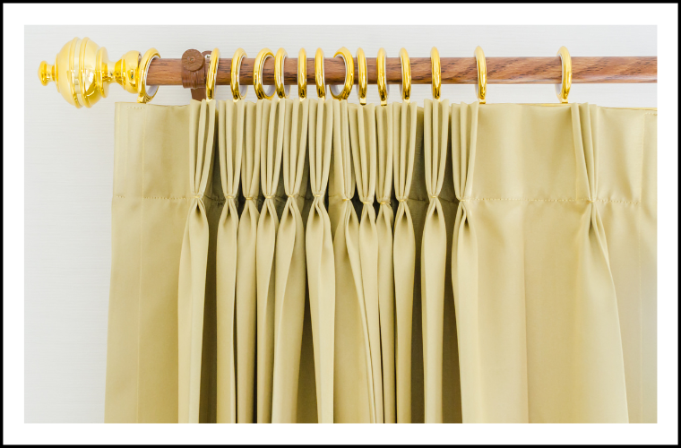 Pencil pleat curtains have a back tape running across top (full width) of the curtain, with cords running through that are pulled to achieve the desired gather. They can be hung from any curtain track using hooks or from a curtain rod using rings with hooks.
