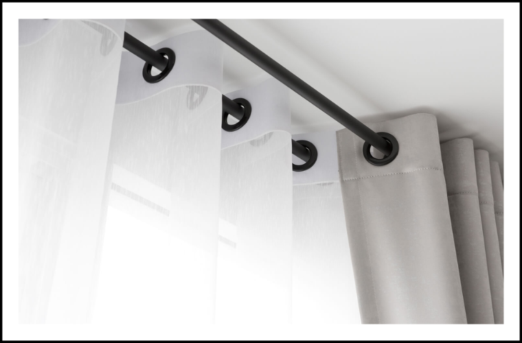 Eyelet curtains hang off a curtain pole with the pole running through metal-edged holes (eyelets) and fall in neat and even pleats. When open they stack back neatly without the need for a curtain tieback.